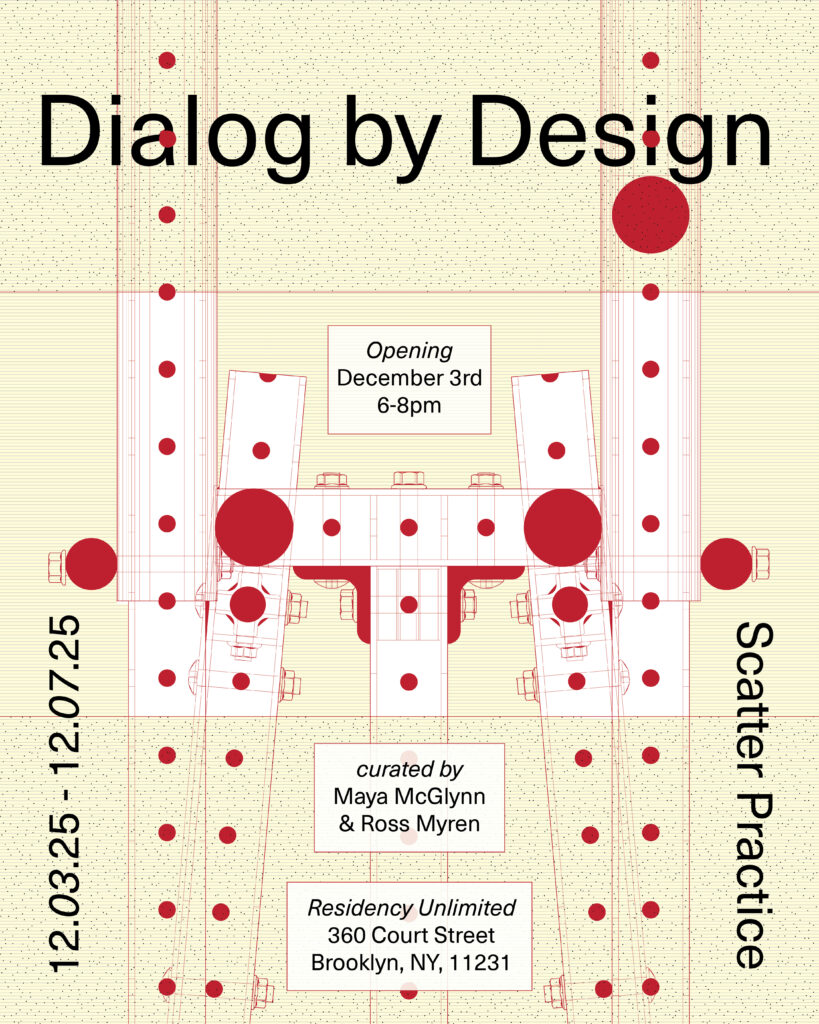 Opening reception: Wednesday, December 3, 2025 | 6:00 – 8:00 pm On view: December 4 – 7, 2025 Hours: Dec 4 – 6: 12-6pm / Dec 7: 12-5pm Location: Residency Unlimited, 360 Court Street (main green church doors), Brooklyn, NY 11231 (map) “Dialog by Design” marks the first solo show of Scatter Practice, a design […]