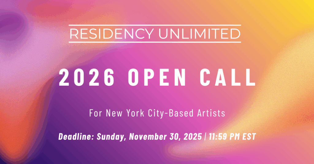 Residency Unlimited (RU) is excited to announce an open call for the 2026 NYC-Based Artist Residency (NYCBAR) Program. This program is dedicated to supporting NYC-based artists traditionally underrepresented in the arts. RU encourages applications from artists who self-identify as part of underserved communities, including but not limited to BIPOC and LGBTQ+ individuals. The 2026 NYCBAR […]