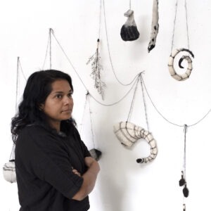 Ruth Jeyaveeran lives and works in Brooklyn, New York. Her work is rooted in traditional material practices and shaped by her experience within the South Asian diaspora. She uses textiles to explore shared histories of alienation and dissociation. In her felted drawings, soft sculptures, and installations, wool transforms into skin, soil, or map. Each piece becomes an intimate excavation as she layers fiber like sediment, allowing unexpected marks to rise to the surface. This process draws from both land and body, revealing cycles of trauma and renewal. By collaborating with material and process, Jeyaveeran allows long-buried truths to emerge.